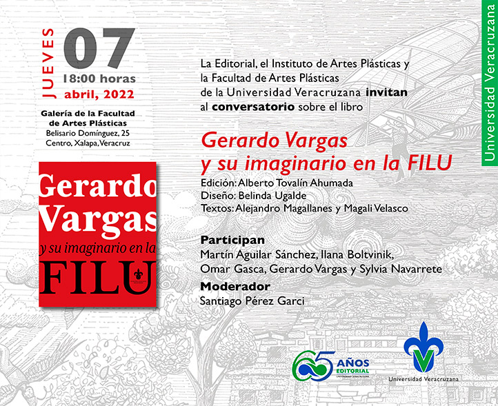 Xalapa, Ver., 05 de abril de 2022.- El artista gráfico, Gerardo Vargas Frías, dará a conocer su libro Gerardo Vargas y su imaginario en la FILU, el jueves 7 de abril a las 18:00 horas, en la Galería de la Facultad de Artes Plásticas de la Universidad Veracruzana (UV), acompañado del rector Martín Aguilar Sánchez, así como de los artistas, investigadores y académicos Omar Gasca, Ilana Boltvinik, Sylvia Navarrete y Santiago Pérez Garci.