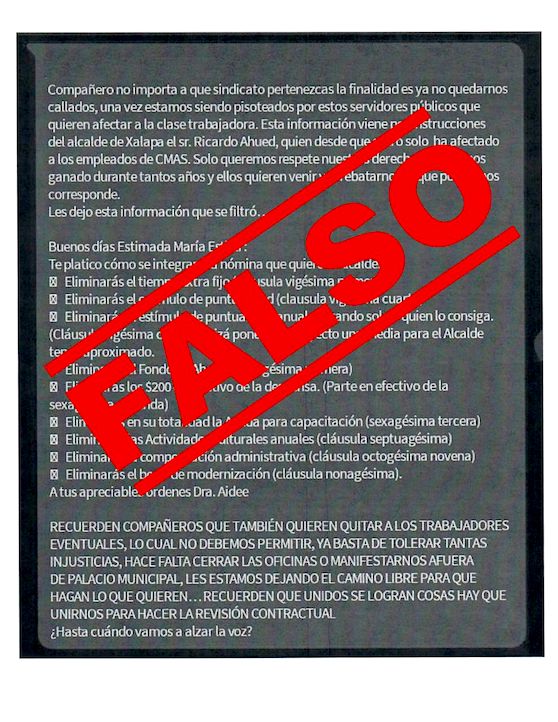 Xalapa, Ver., 07 de abril de 2022.- El Ayuntamiento da a conocer que la información que presuntamente circula a través de servicios de mensajería móvil alrededor de supuestas modificaciones a las condiciones contractuales al interior de la Comisión Municipal de Agua Potable y Saneamiento, es falsa. Al mismo tiempo, reitera su compromiso y respeto con las justas conquistas laborales de las y los trabajadores.