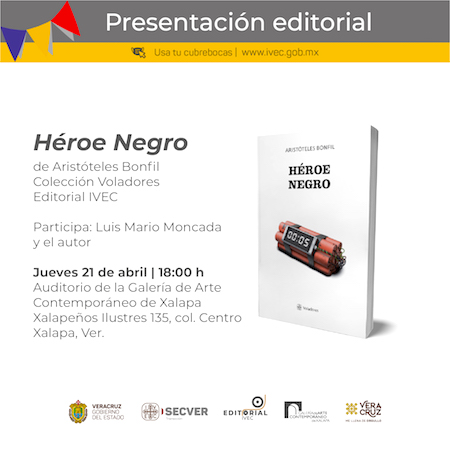 Xalapa, Ver., 19 de abril de 2022.- El Instituto Veracruzano de la Cultura continúa de manera presencial con el programa “Jueves de libros” que esta semana presenta Héroe Negro, obra de Aristóteles Lara Bonfil publicada por la editorial IVEC en la colección Voladores. La actividad será el próximo 21 de abril a las 18:00 horas, en el auditorio de la Galería de Arte Contemporáneo de Xalapa.