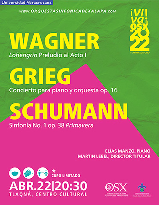 Xalapa, Ver., 19 de abril de 2022.-La Orquesta Sinfónica de Xalapa (OSX) de la Universidad Veracruzana (UV) presentará el viernes 22 de abril a las 20:30 horas en Tlaqná, Centro Cultural, un concierto de matices románticos con obras de Richard Wagner, Robert Schumann y Edvard Grieg.