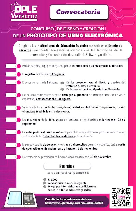 Xalapa, Ver., 13 de mayo de 2022. El Organismo Público Local Electoral del Estado de Veracruz a través de la Comisión Especial de Innovación y Evaluación, convoca a las Instituciones de Educación Superior con sede en el Estado de Veracruz, con oferta académica relacionada con las Tecnologías de la Información y Comunicación, desarrollo de software y/o afines, a participar en el Concurso de diseño y creación de un prototipo de urna electrónica con características y especificaciones técnicas que permitan su utilización en procesos electorales locales, mecanismos de participación ciudadana locales y elecciones escolares.