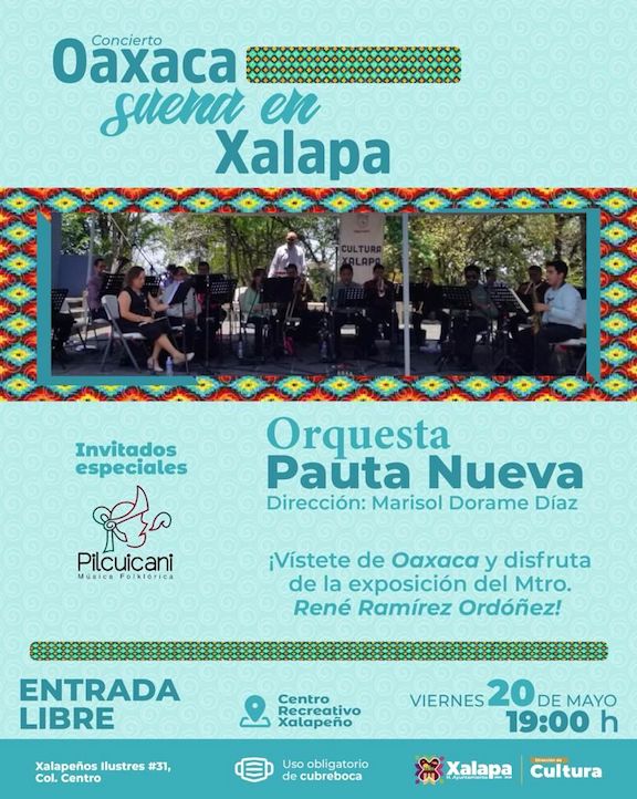 Como parte del Cine Club del Centro Recreativo Xalapeño (CRX), el 19 de mayo a las 20:00 horas, en el Foro “Guadalupe Balderas”, se proyectará la película “Solo los amantes sobreviven”, del director Jim Jarmusch; el viernes 20 a las 19:00 horas, la Orquesta Pauta Nueva y el Grupo Pilcuicani ofrecerán un concierto con música de Oaxaca, también en el CRX. Este evento engalanará la muestra de indumentarias de esa región, expuestas en la sala 1, 2 y 3. Se trata de una colección del maestro René Ramírez Ordóñez. Se invita a todos los asistentes a llevar ropa típica de aquella región.