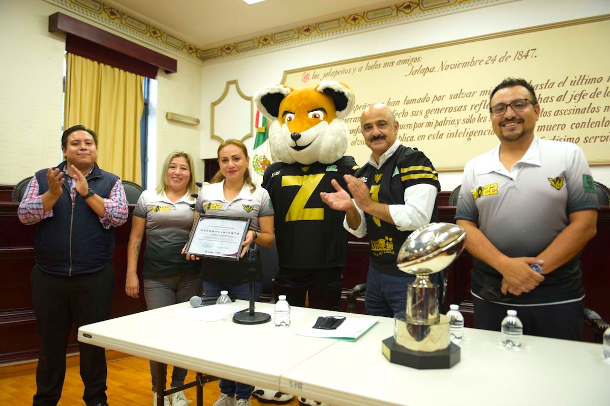 Xalapa, Ver., 14 de junio de 2022.- Para el Ayuntamiento de Xalapa es una distinción y un orgullo recibir al equipo Zorros Dorados, pues con base en su disciplina, trabajo, constancia y tenacidad pusieron en alto el nombre de Xalapa en el nivel nacional, afirmó el presidente municipal Ricardo Ahued Bardahuil durante la entrega de un reconocimiento al equipo que recientemente ganó el campeonato en la Categoría Juvenil de la liga ONEFA.