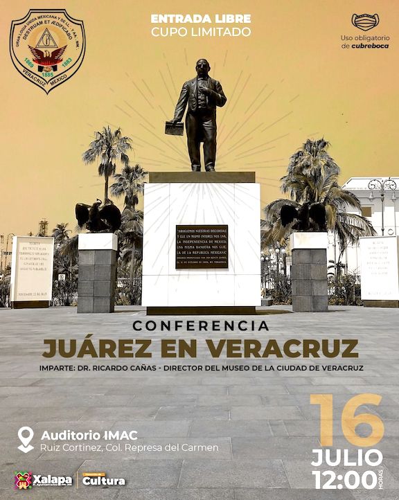 El 16 de julio a las 12:00 horas, en el auditorio del IMAC, el doctor Ricardo Cañas, director del Museo de la Ciudad de Veracruz, impartirá la conferencia «Juárez en Veracruz”.