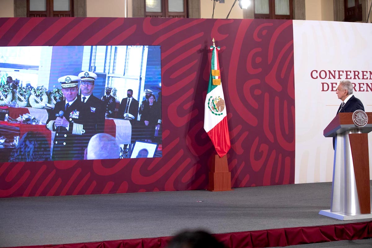 El presidente López Obrador reiteró sus condolencias y apoyo a familiares de marinos caídos en el cumplimiento de su deber; los integrantes de la Semar respaldaron la misión de aprehender a Caro Quintero. Además, deseó recuperación al oficial que se reporta herido de gravedad.