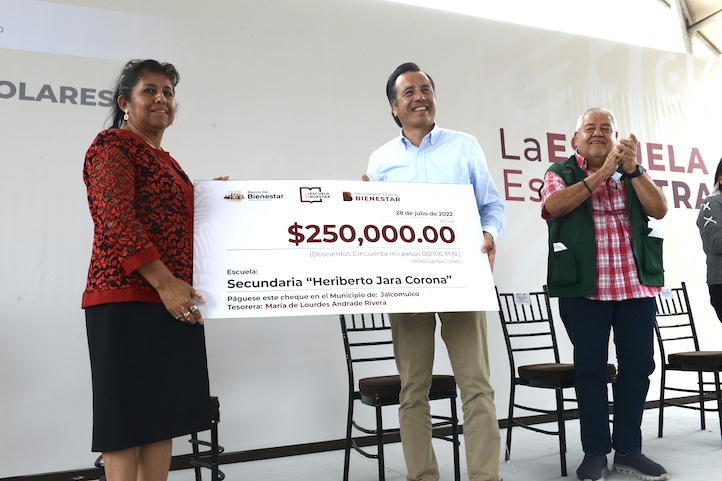 Acompañado por el delegado estatal de Programas para el Desarrollo, Manuel Huerta Ladrón de Guevara, entregaron los recursos a cada Comité Escolar de Administración Participativa de Actopan, Jalcomulco y Xalapa, del programa La Escuela es Nuestra.