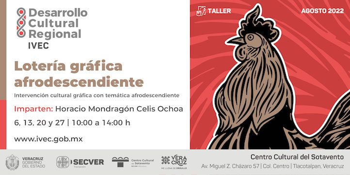 Xalapa, Ver., 29 de julio de 2022.- El Instituto Veracruzano de la Cultura invita a participar en el taller Lotería gráfica afrodescendiente. Intervención cultural gráfica con temática afrodescendiente, impartido por el artista visual Horacio Mondragón los sábados 06, 13, 20, y 27 de agosto, de 10:00 a 14:00 horas, en el Centro Cultural del Sotavento en Tlacotalpan, Veracruz.