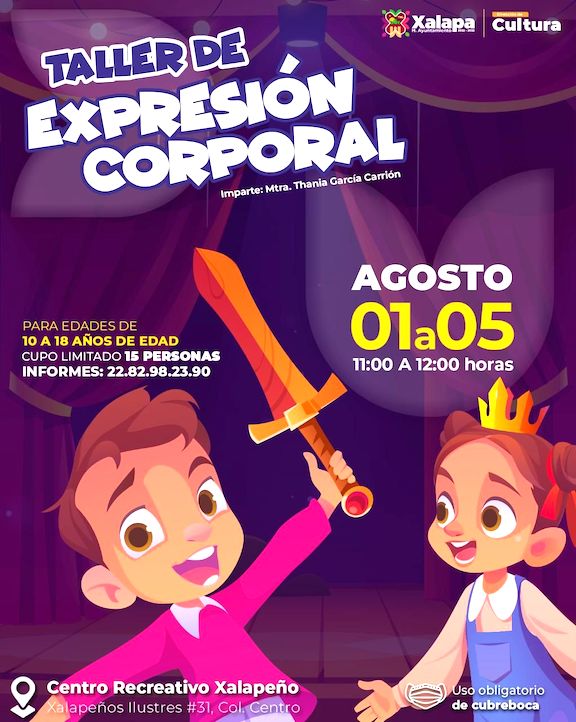 Este lunes, a las 16:00 horas en el Centro Recreativo Xalapeño (CRX) se llevará a cabo la Reunión de Cuentistas; asimismo, del 1 al 5 de agosto, se llevarán a cabo los talleres de “Movimiento y Baile para Niños”, y de “Expresión Corporal”; por su parte, en el Taller de Arte Popular (TAP), Katia Alvarado Galindo ofrecerá Talleres de Defensa Personal para Mujeres, como parte de la Cultura de la Prevención.