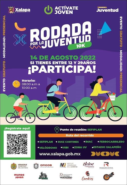 Xalapa, Ver., 10 de agosto de 2022.- Con el propósito de promover la convivencia familiar, el uso de la bicicleta y conmemorar el Día Internacional de la Juventud, este domingo 14 de agosto se desarrollará la “Rodada por la Juventud”, evento con el que además se incentiva la actividad física y el uso de medios alternativos de transporte que no dañan al ambiente.