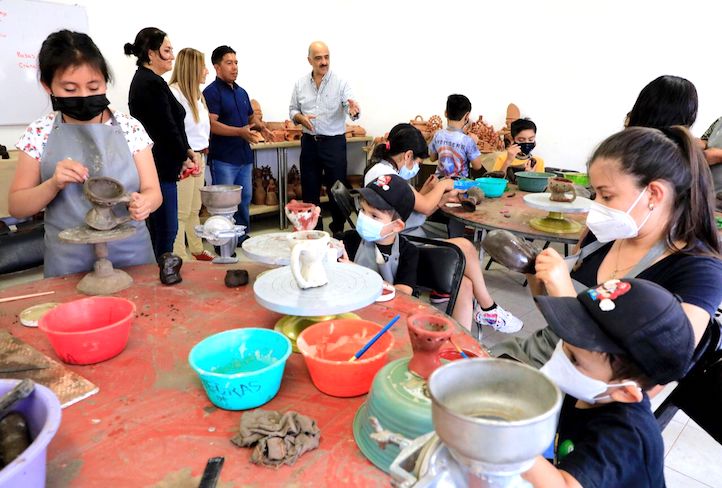 Acompañado por la directora de Cultura, Karla Montano Rocher, el Alcalde conoció la labor que maestros, niñas y niños realizan en los talleres gratuitos de alfarería, orfebrería, talla de madera y cartonería. Ahí, se elaboran desde instrumentos musicales hasta máscaras de madera y barro; también calaveras, piñatas, alcancías en forma de animales, jarrones y alhajeros, entre otras manualidades y artesanías.