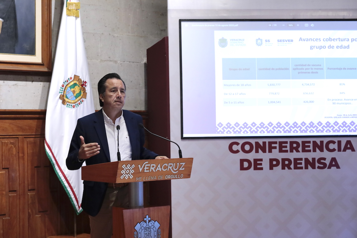 Xalapa, Ver., 15 de agosto de 2022.- El gobernador Cuitláhuac García Jiménez dio a conocer que 4 millones 777 mil 411 veracruzanas y veracruzanos tienen el esquema completo de vacunación contra COVID-19: un millón 217 mil 332 a través de Pfizer BioNTech, un millón 428 mil 444 con AstraZeneca, un millón 602 mil 825 con CanSino y 528 mil 810 a las que se aplicó Sinovac.