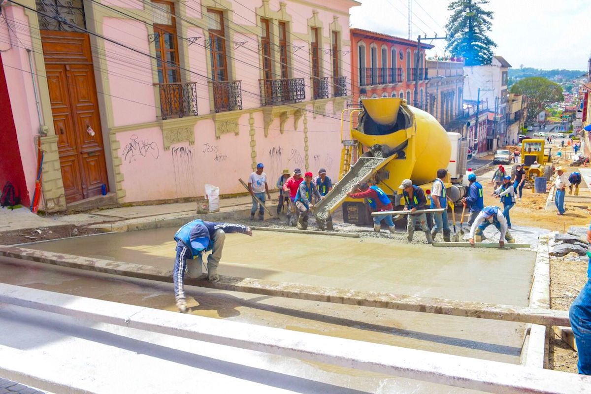 Xalapa, Ver., 17 de agosto de 2022.- Avanza la pavimentación de concreto hidráulico en la calle Francisco Javier Clavijero, proceso constructivo final de la primera parte del tramo a rehabilitar en esta céntrica vialidad.