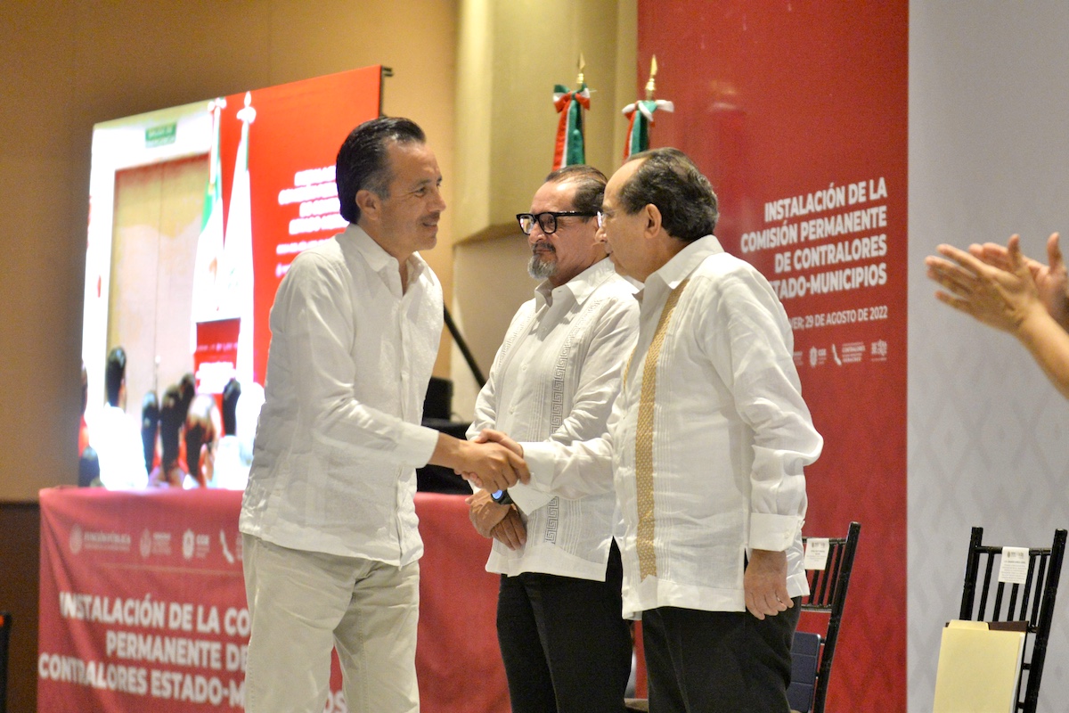 Boca del Río, Ver., 29 de agosto de 2022.- La renovación de alcaldías a partir de este año marcó una nueva sinergia de rendición de cuentas y transparencia en la aplicación de los recursos públicos, por lo cual el gobernador Cuitláhuac García Jiménez felicitó a las autoridades representantes de los 212 municipios para la firma e instalación de la Comisión Permanente de Contralores Estado – Municipios.