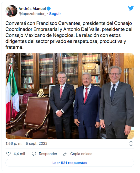 Ciudad de México, 05 de septiembre de 2022.- El presidente Andrés Manuel López Obrador destacó en sus redes sociales que la relación del Gobierno de México con los dirigentes del sector privado es respetuosa, productiva y fraterna.