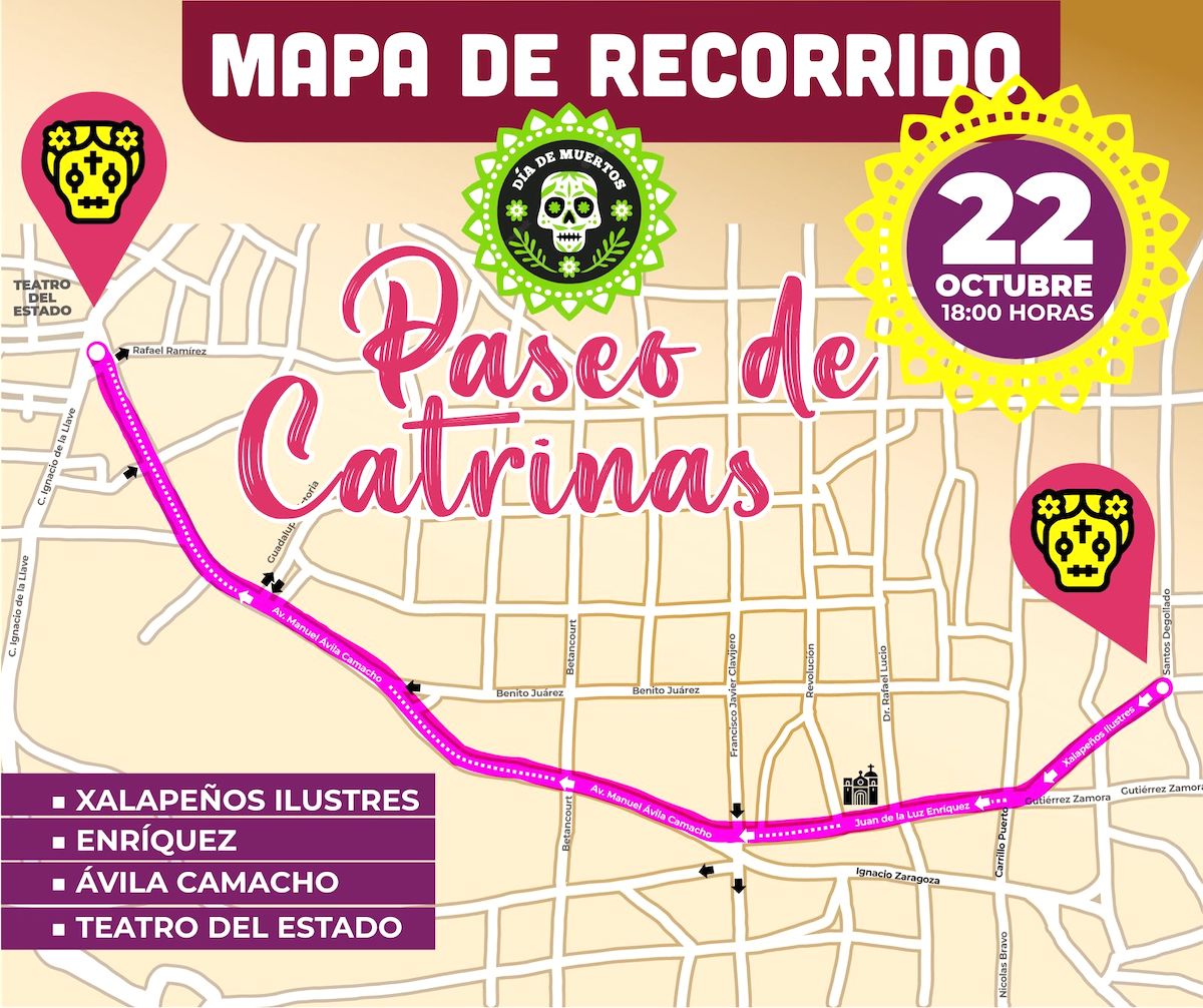 El evento se desarrollará este sábado 22 de octubre a las 18:00 horas. Se contempla realizar un recorrido de 3.5 kilómetros, partiendo de Xalapeños Ilustres y Santos Degollado, para luego tomar la calle Enríquez y la avenida Manuel Ávila Camacho, hasta llegar al Teatro del Estado.