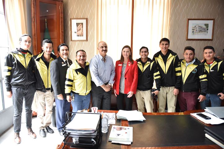Para dar la bienvenida, abanderar y expresar sus mejores deseos a los Búhos Marching Band, el presidente municipal Ricardo Ahued Bardahuil recibió en su despacho a la presidenta del desfile, Amy Wainscott, y a una comitiva de los alumnos.