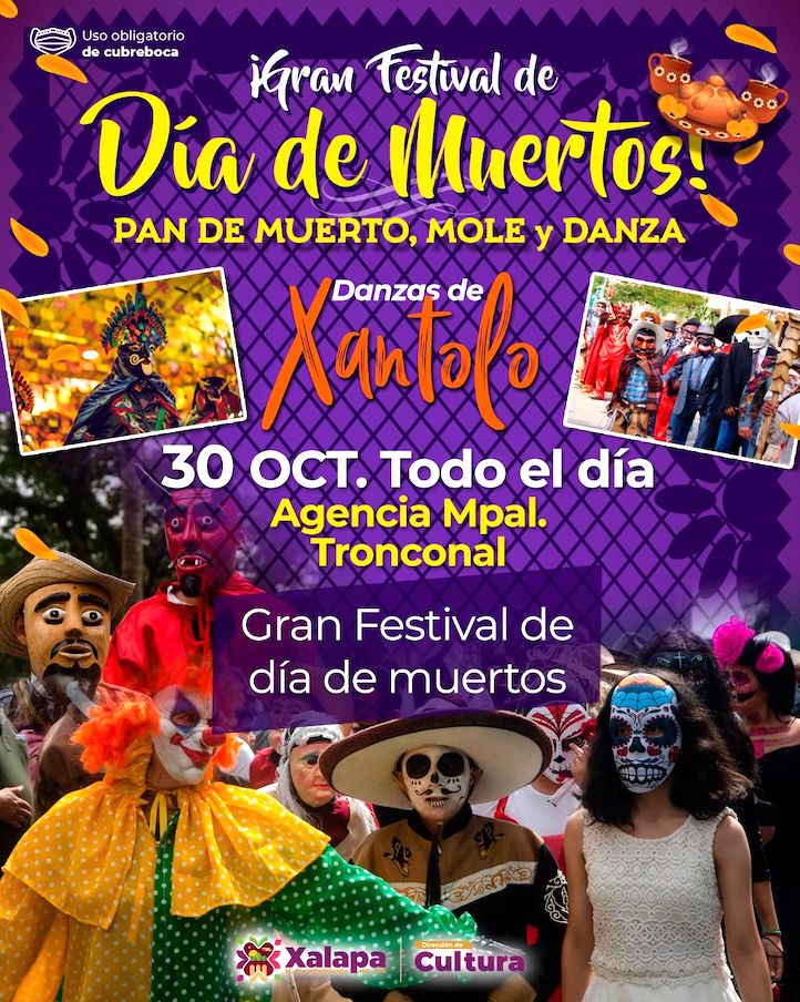 En el mismo periodo, estará abierto al público el Festival Escénico para Vivos y Muertos “Tzompantli”, con recorridos a partir de las 18:30 horas en sus dos sedes: Tlanextli Quinta Premium y Casa Doña Falla (desde el sábado 29). El 29 y 30 de octubre se realizará el Festival Noche de Catrinas en el Barrio de Xallitic, que contará con la participación del Ballet Folklórico de la ESAV y la Orquesta Municipal de Xalapa.
