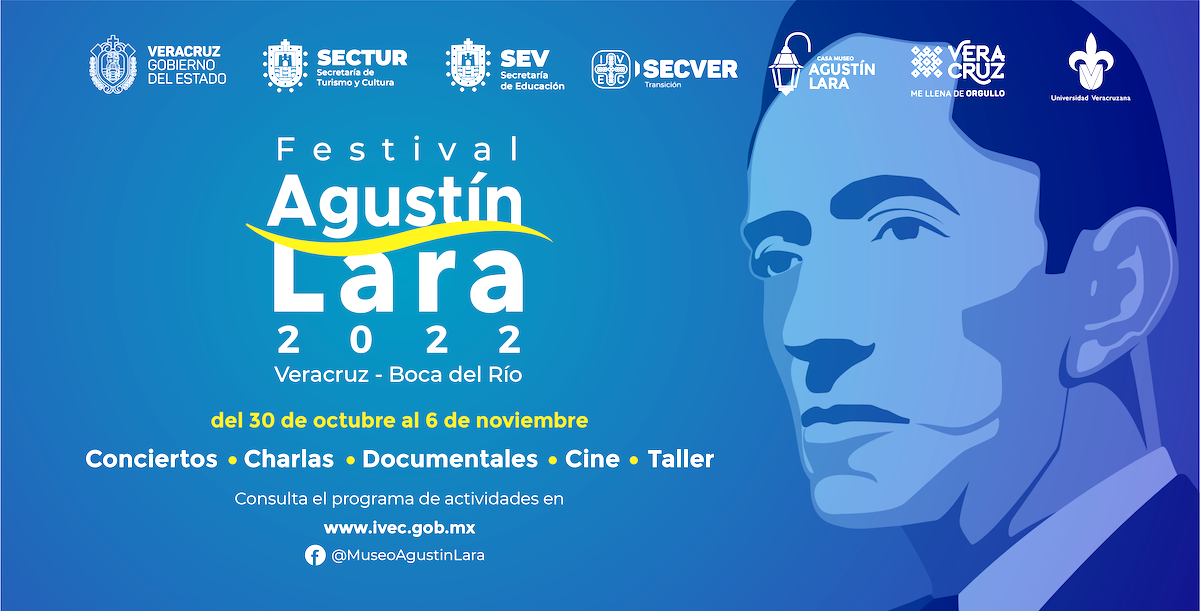 Xalapa, Ver., 28 de octubre de 2022.- El Instituto Veracruzano de la Cultura (IVEC) invita a disfrutar del Festival Agustín Lara 2022, del 30 de octubre al 06 de noviembre para rendirle homenaje con un programa de conciertos, charlas, documentales y talleres en la Casa Museo Agustín Lara en Boca del Río; el Callejón Toña la Negra y la avenida Martí, en el municipio de Veracruz; algunas de ellas se transmitirán desde la página de Facebook @MuseoAgustínLara.