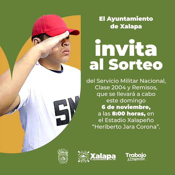 Xalapa, Ver., 05 de noviembre de 2022.- Este domingo 6 de noviembre, a las 8:00 horas, se realizará el Sorteo del Servicio Militar Nacional Clase 2004 y Remisos en el Estadio Xalapeño “Gral. Heriberto Jara Corona”, por lo que el Ayuntamiento, exhorta a los jóvenes que cumplieron con la Fase de Alistamiento asistir a este acto, el cual será presidido por autoridades municipales y militares.