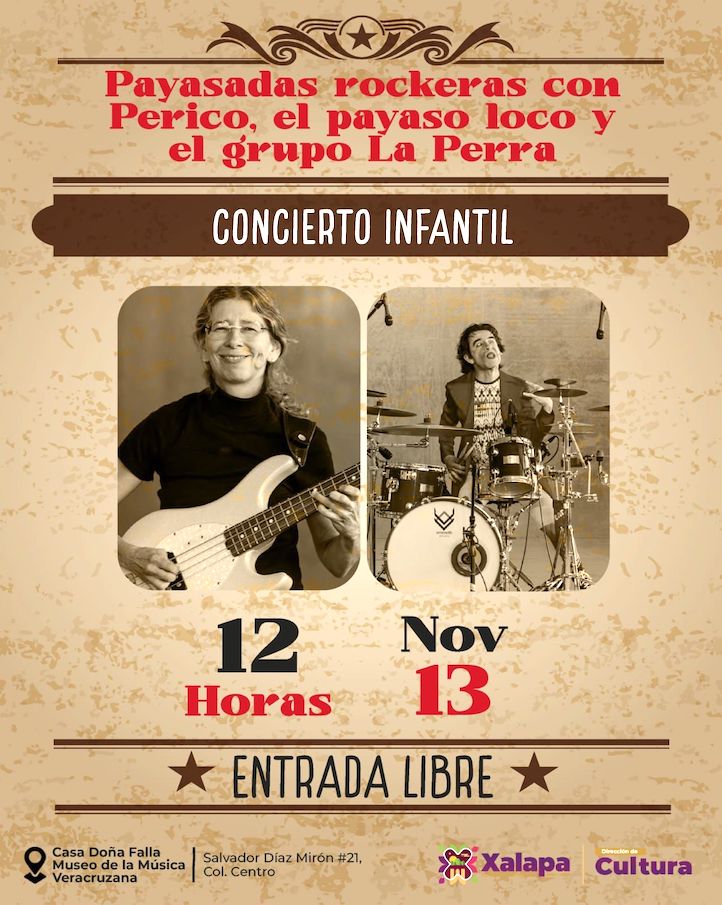 Perico El Payaso Loco y el grupo La Perra se presentarán el domingo 13 de noviembre a las 12:00 horas, en el Museo de la Música Veracruzana “Casa Doña Falla”. La entrada es libre y el cupo limitado.