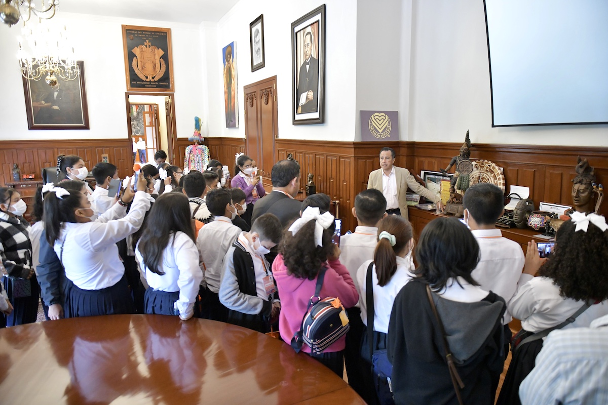 Acompañado por el secretario de Educación, Zenyazen Escobar García, les brindó un recorrido por la sede del Poder Ejecutivo en el que explicó la participación del estado en la historia y conformación de lo que hoy es México.