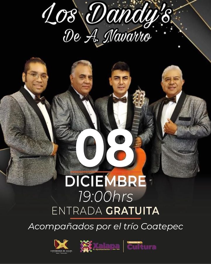 Xalapa, Ver., 24 de noviembre de 2022.- Como parte de la cartelera cultural que ofrece el Ayuntamiento para que todos los sectores de la sociedad disfruten de manifestaciones artísticas de primer nivel, el próximo 8 de diciembre, a las 19:00 horas, se presentarán en el Patio Central de Palacio Municipal Los Dandy’s, de don Armando Navarro.