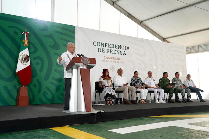 Campeche, 05 de diciembre de 2022.- El presidente Andrés Manuel López Obrador anunció que los aeropuertos de Chetumal, Palenque y Campeche serán administrados por Olmeca-Maya-Mexica, empresa a cargo de la Secretaría de la Defensa Nacional.