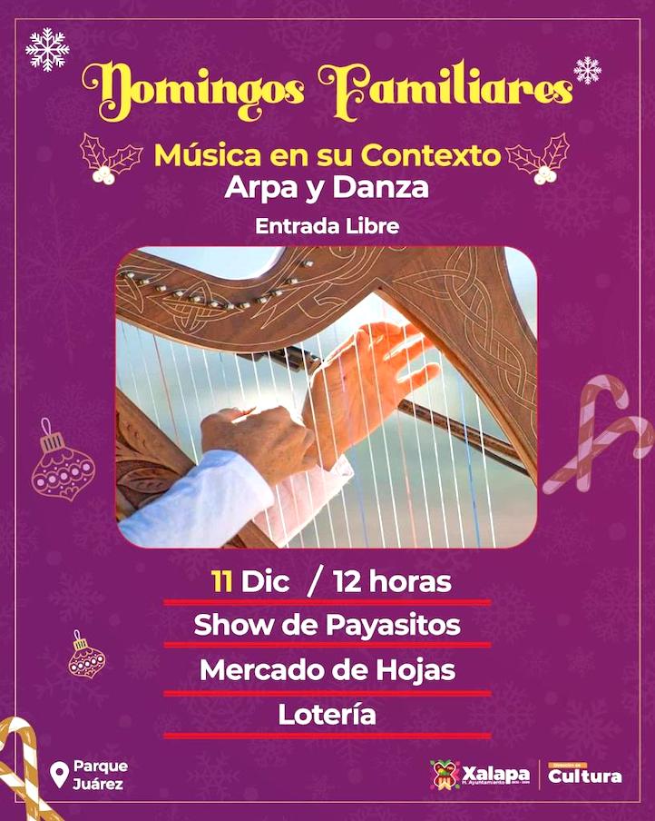 El domingo 11 de diciembre habrá música de arpa y danza, así como un show de payasitos, mercado de hojas y lotería en el parque Juárez desde las 12:00 horas; a esa hora y a las 17:00 horas, la maestra Elizabeth Juárez y las Mujeres y la Música Coral, respectivamente, presentarán un show musical para celebrar el primer aniversario de la Casa Doña Falla.