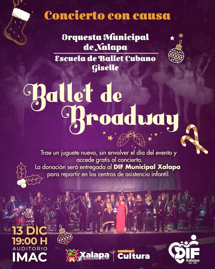 A esta misma hora, pero en el auditorio de la IMAC, la Orquesta Municipal de Xalapa y la Escuela de Ballet Cubano “Giselle” ofrecerán el concierto “Ballet de Broadway”, cuyo acceso será gratuito para quienes lleven un juguete nuevo sin envolver, mismo que será entregado al DIF Municipal para repartir en los Centros de Asistencia.