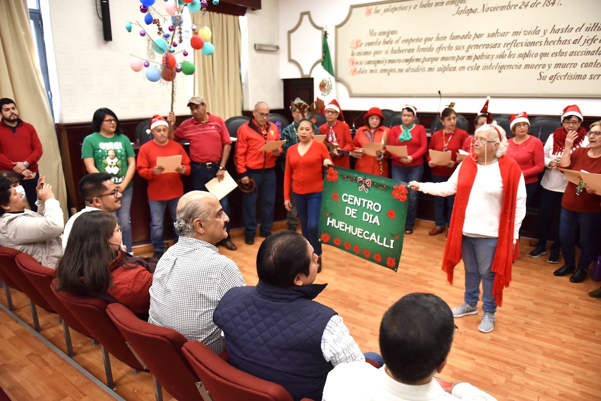 Xalapa, Ver., 15 de diciembre de 2022.- Este jueves, el presidente municipal Ricardo Ahued Bardahuil recibió en la Sala de Cabildo a personas adultas mayores integrantes de la Casa de Día Huehuecalli, espacio a cargo del DIF Municipal ubicado en Xalapa 2000, quienes acudieron al Palacio Municipal a cantar la tradicional Rama y compartir algunos villancicos con las y los presentes.