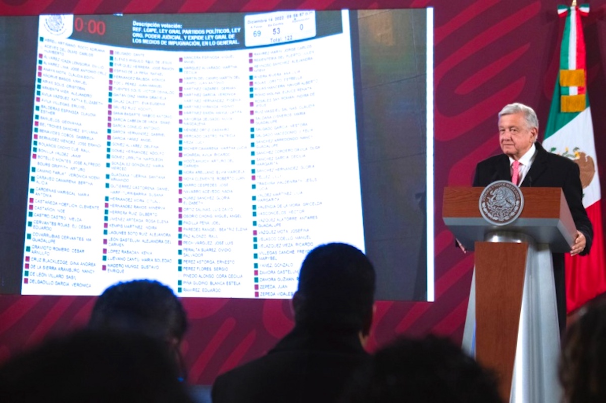 Ciudad de México, 15 de diciembre de 2022.- El presidente Andrés Manuel López Obrador reconoció a las y los senadores por aprobar en lo general y en lo particular el proyecto con el que se reforman diversas disposiciones en materia electoral que garantizarán democracia, austeridad y eficiencia en los comicios.