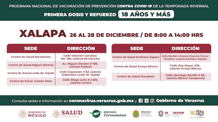 En la página http://coronavirus.veracruz.gob.mx encontrarás el reporte de casos vigente y las convocatorias a detalle del Plan Nacional de Vacunación. Ante síntomas leves de la enfermedad llama al 800 0123456 y por algún evento de gravedad asiste al hospital más cercano.