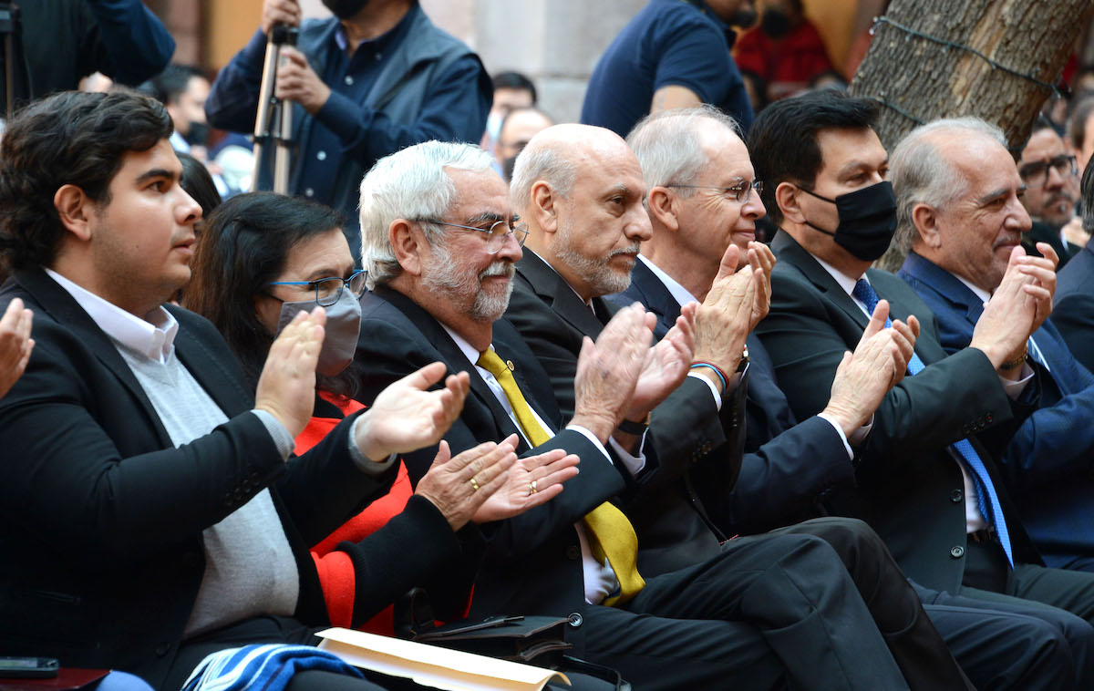 En la Ceremonia Conmemorativa por el Centenario de la Autonomía de la UASLP participaron el rector de esa casa de estudios, Alejandro Zermeño Guerra; el subsecretario de Educación Superior de la Secretaría de Educación Pública, Luciano Concheiro Bórquez; y el secretario General Ejecutivo de la Asociación Nacional de Universidades e Instituciones de Educación Superior, Jaime Valls Esponda, entre otras autoridades.