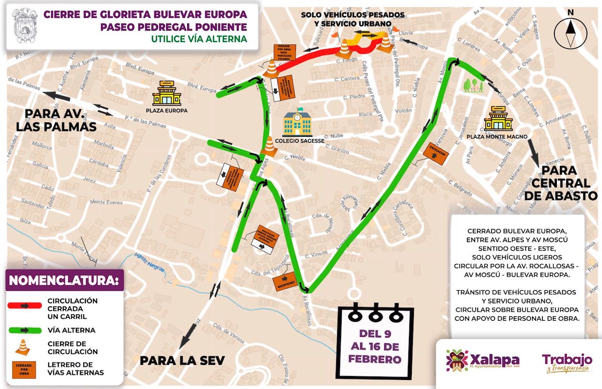 Xalapa, Ver., 08 de febrero de 2023.- Derivado de la rehabilitación de losas de concreto hidráulico que el Ayuntamiento realiza en el Bulevar Europa, a partir de las 15:00 horas de mañana jueves se iniciarán los trabajos de demolición y reparación de pavimento en este bulevar, entre las calles Moscú y Alpes, por lo habrá un cierre parcial en esta vialidad.