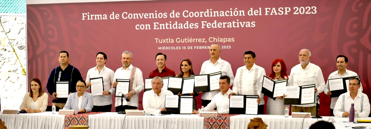 Tuxtla Gutiérrez, Chis., 15 de febrero de 2023.- El gobernador Cuitláhuac García Jiménez firmó el Convenio de Coordinación del Fondo de Aportaciones para la Seguridad Pública (FASP) 2023 con Entidades Federativas, del cual corresponden 302 millones de pesos a Veracruz a efecto de mejorar sus indicadores y lograr la paz social.