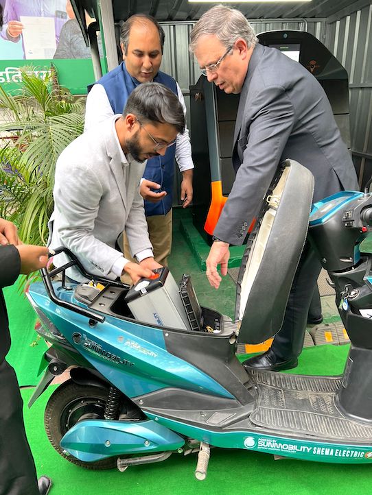 El canciller Ebrard también se reunió con Rajat Malhan, vicepresidente de SUN MOBILITY, que opera un sistema de estaciones de recarga inmediata de baterías para motocicletas eléctricas.