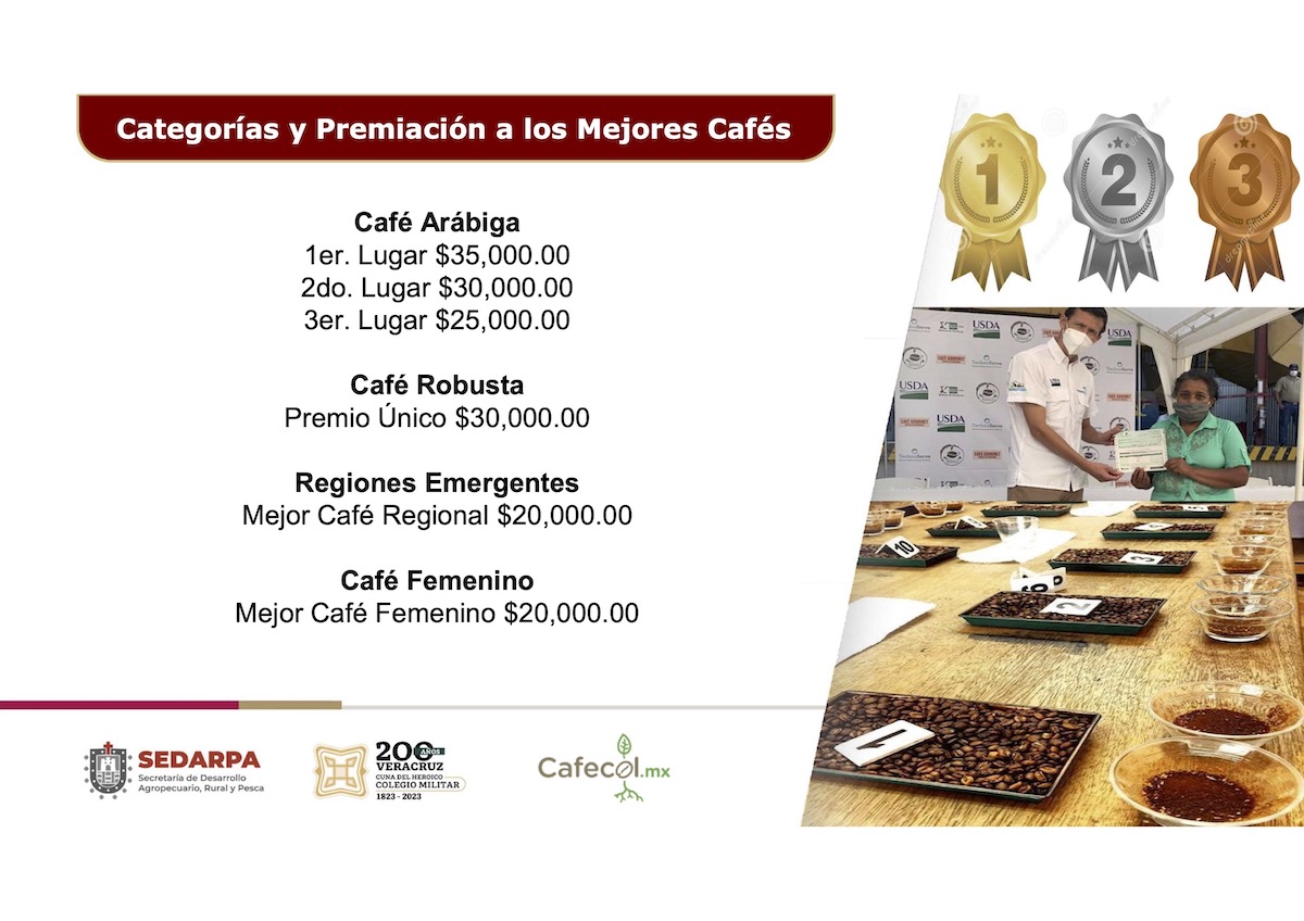 Los resultados serán publicados el 02 de junio, semifinalistas y el 30 del mismo mes, finalistas; 01 y 02 de julio se realizará el Festival Estatal Café Veracruz. El día 30 tendrá lugar la premiación y quien presente el mejor café arábiga ganará hasta 35 mil pesos; robusta, 30 mil; emergente y femenino, 20 mil. Los detalles los puedes encontrar en http://www.veracruz.gob.mx/agropecuario/.
