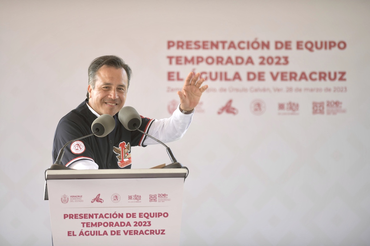 Úrsulo Galván, Ver., 28 de marzo de 2023.- Autoridades estatales y directivos presentaron a la plantilla oficial de El Águila de Veracruz para la temporada 2023 de la Liga Mexicana de Béisbol desde la zona arqueológica de Zempoala, “pues quisimos vincular el rescate de un equipo de mucha historia con todo lo que significa nuestro estado”, afirmó el gobernador Cuitláhuac García Jiménez.