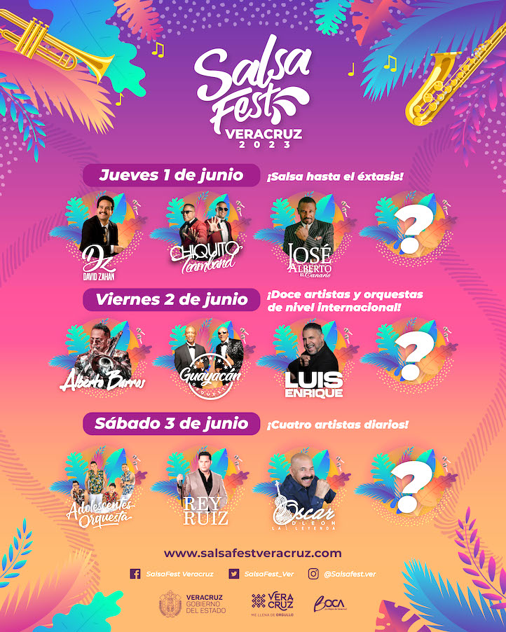 Cada noche abrirán dos grupos locales de excelente nivel, además de que habrá un cantante internacional más, invitado sorpresa, para un total de 18 exponentes del género, afirmó el mandatario, explicando que la entrada al Salsódromo sigue siendo gratuita previo registro y solicitud de boletos en la página https://www.salsafestveracruz.com/.