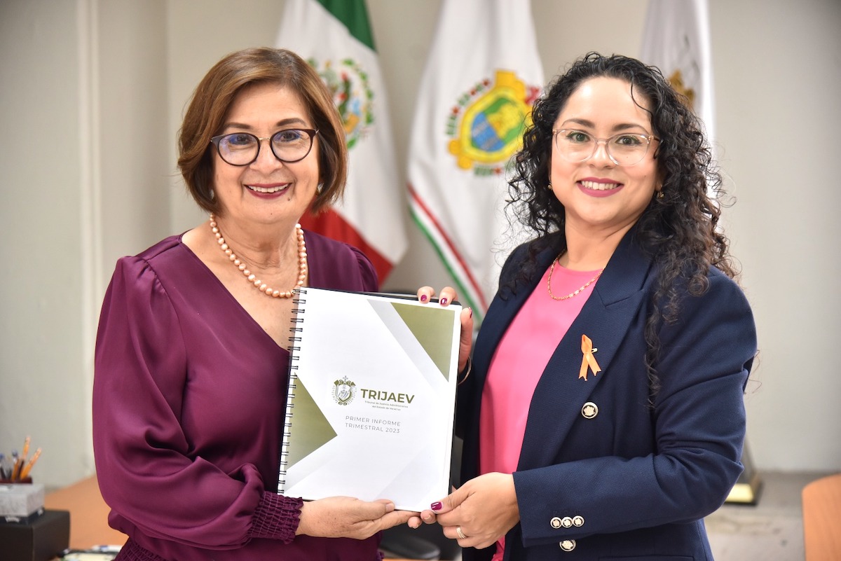 Xalapa, Ver., 25 de abril de 2023.- La presidenta de la Mesa Directiva de la LXVI Legislatura, diputada Margarita Corro Mendoza, recibió de la presidenta del Tribunal de Justicia Administrativa del Estado de Veracruz (Trijaev), magistrada Leticia Aguilar Jiménez, el Primer Informe Trimestral de este organismo autónomo, que incluye los estados financieros del ejercicio del gasto público correspondiente al periodo enero-marzo de 2023.