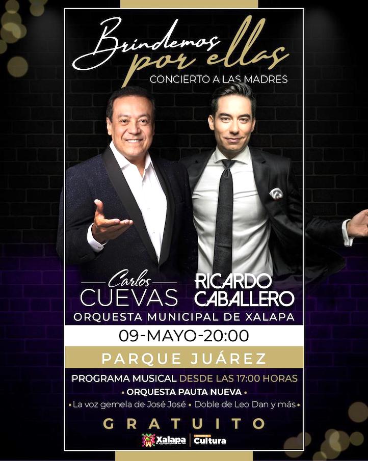 La jornada se cierra a las 20:00 horas, con el concierto “Brindemos por ellas”, a cargo de Carlos Cuevas y Ricardo Caballero, quienes estarán acompañados por la Orquesta Municipal de Xalapa.