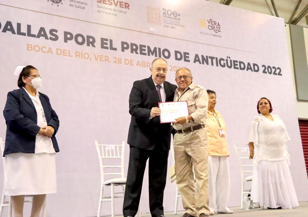Boca del Río, Ver., 28 de abril de 2023.- Por dedicar su vida laboral a garantizar la atención médica de la población veracruzana, la Secretaría de Salud (SS) entregó medallas y reconocimientos a mil 175 trabajadores con 65, 55, 50, 45, 40, 35, 30, 25 y 20 años de antigüedad en las diferentes áreas.
