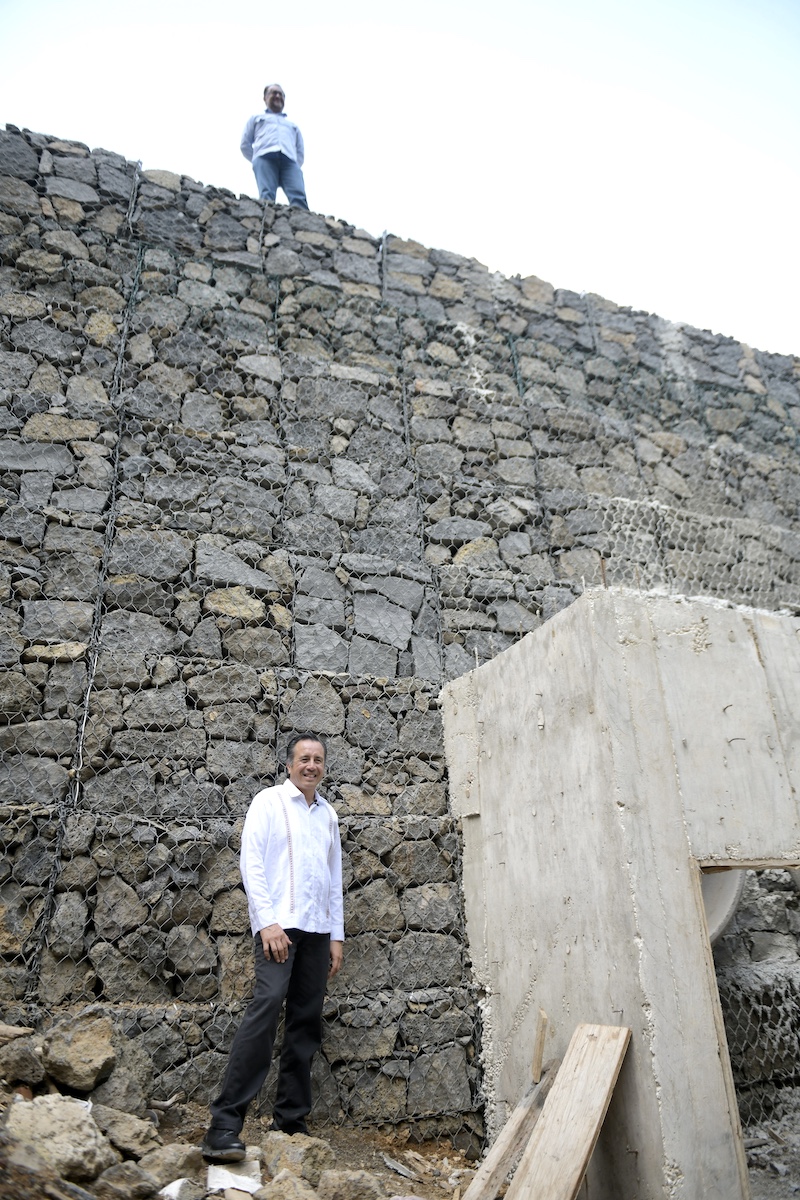 Además de dicha rehabilitación, el mandatario estatal explicó que la obra incluye dos muros de contención para corregir el deslizamiento de material, canalizando el agua hacia un punto y evitando el desgaje, pues se detectó una falla geológica en el sitio.
