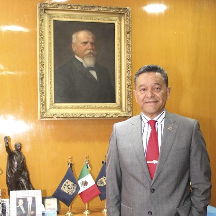 Bajo el escudo de la Universidad Nacional Autónoma de México y el retrato del gran educador Justo Sierra, que la fundó, el Dr. Raúl Contreras Bustamante, Director de la Facultad de Derecho, habla para Macroeconomía desde su cubículo universitario.