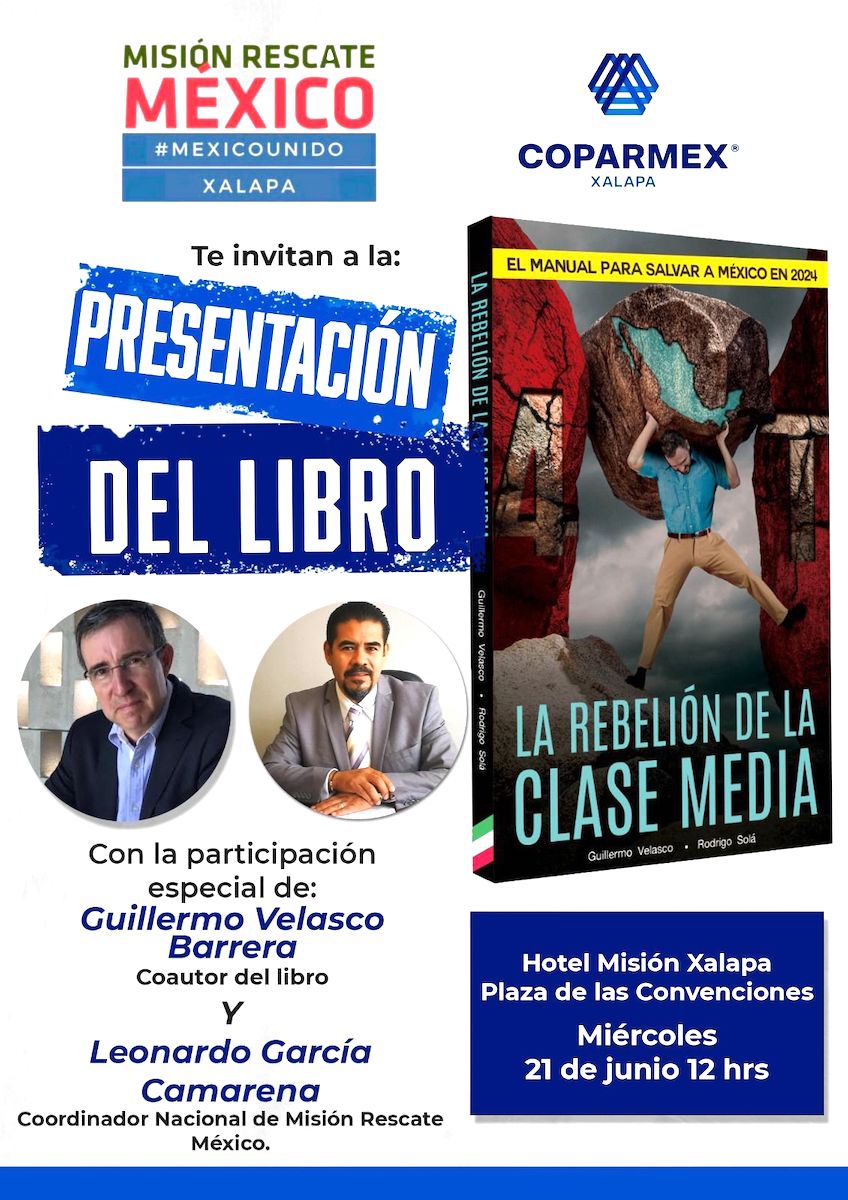 Los días 20 y 21 de junio de 2023 será presentado en Veracruz y Xalapa, el libro La Rebelión de la Clase Media. José Guillermo Velasco Barrera, coautor de la obra y Leonardo García Camarena, Coordinador Nacional de Misión Rescate México, hablarán del origen, contenido y objetivo de esta publicación que ha alcanzado ya 40 mil ejemplares. Los conferencistas sostendrán encuentros con representantes de los medios de Comunicación y líderes de la Sociedad Civil, así como con académicos y jóvenes universitarios; en Xalapa y Veracruz tendrán un encuentro además con empresarios.