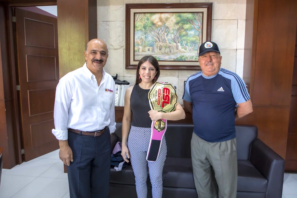 Xalapa, Ver., 16 de junio de 2023.- El presidente municipal Ricardo Ahued Bardahuil recibió en su oficina a la deportista Katia Alejandra Alvarado Galindo, ganadora del Campeonato Absoluto Amateur de Cintas Blancas del Elite Submission League (ESL), uno de los torneos de Jiu jitsu brasileño más importantes de México.