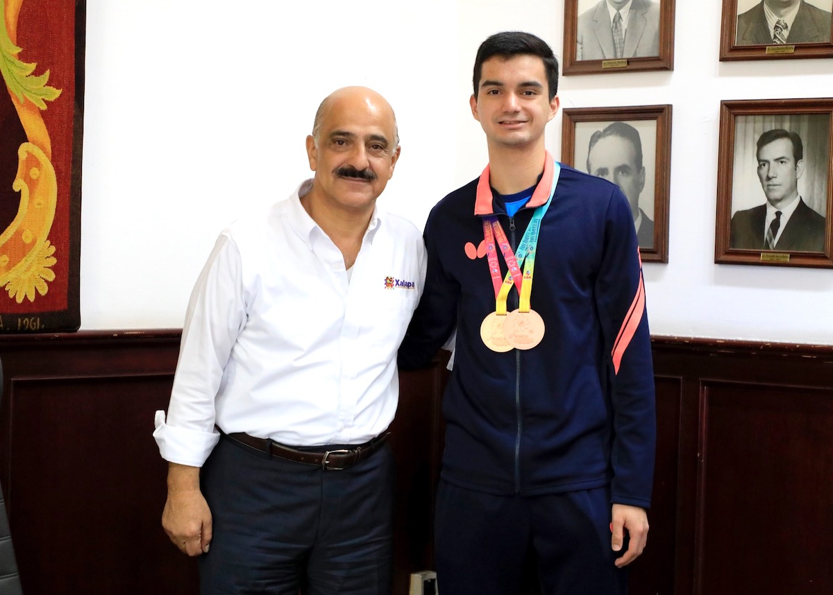 Xalapa, Ver., 09 de agosto de 2023.- El presidente municipal Ricardo Ahued Bardahuil recibió este día a Rogelio Castro Hernández, destacado deportista juvenil en la disciplina de tenis de mesa, quien acudió a su despacho para saludarlo y mostrarle las dos medallas de bronce recientemente obtenidas en el Campeonato Panamericano desarrollado en Charleston, Estados Unidos.