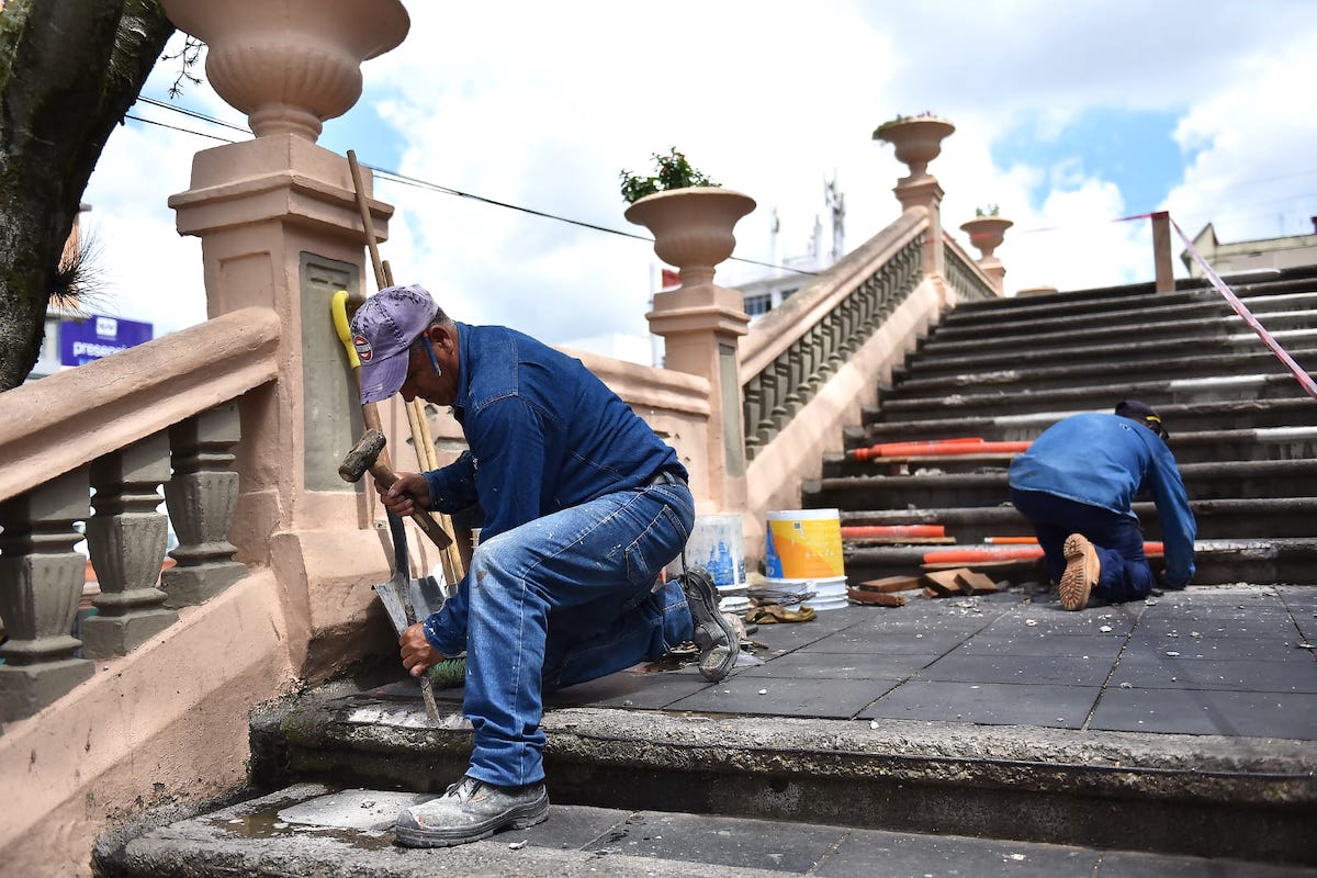 Xalapa, Ver., 28 de agosto de 2023.- Personal de la Dirección de Obras Públicas realiza trabajos de mantenimiento e imagen urbana en las escaleras del parque Benito Juárez que comunican con la Pinacoteca «Diego Rivera».
