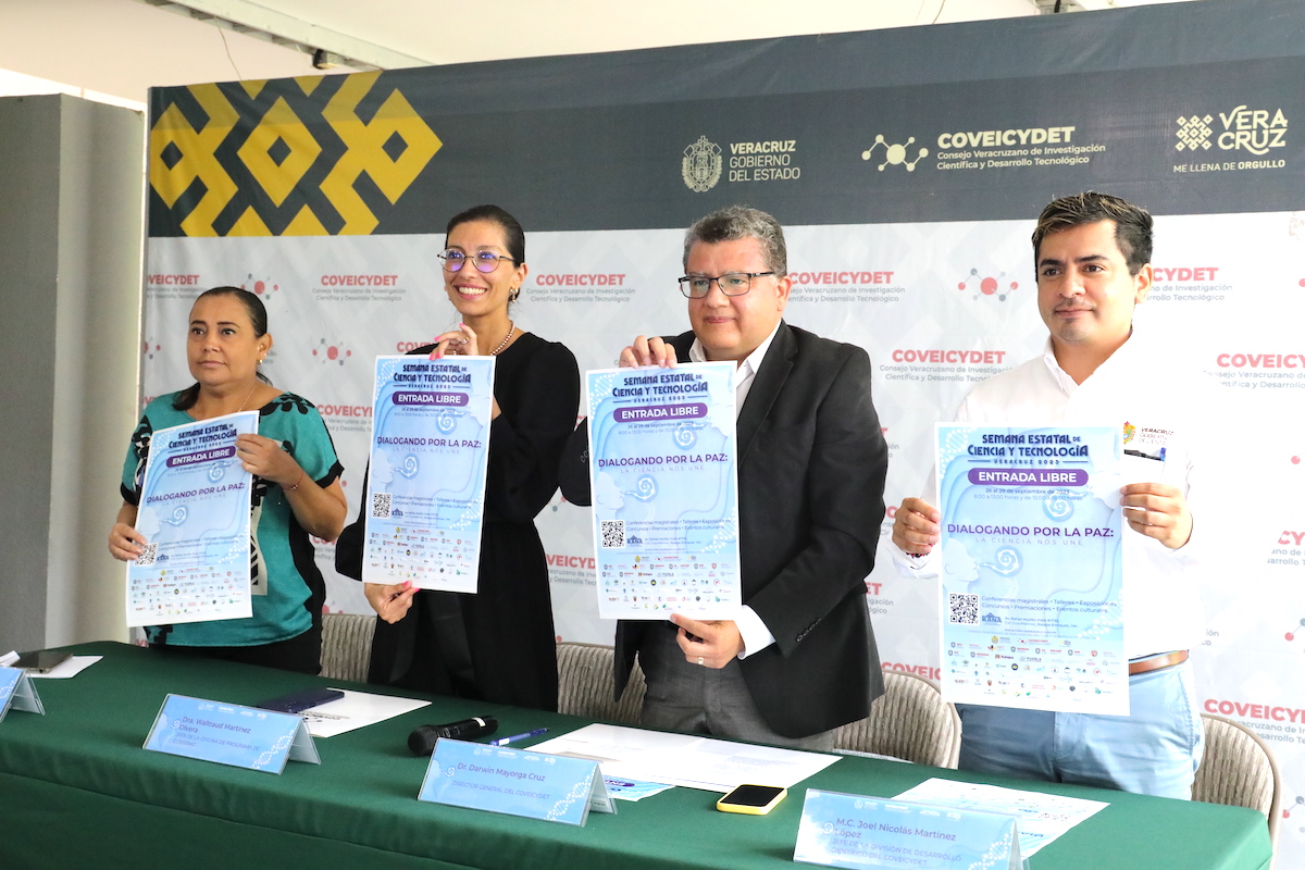 Xalapa, Ver., 30 de agosto de 2023.- El Consejo Veracruzano de Investigación Científica y Desarrollo Tecnológico (COVEICYDET) presentó la segunda edición de la Semana Estatal de Ciencia y Tecnología con el lema Dialogando por la paz: la ciencia nos une, del 26 al 29 de septiembre en el museo Kaná, con el propósito de exponer e impulsar la actividad científico-tecnológica desarrollada en la entidad.