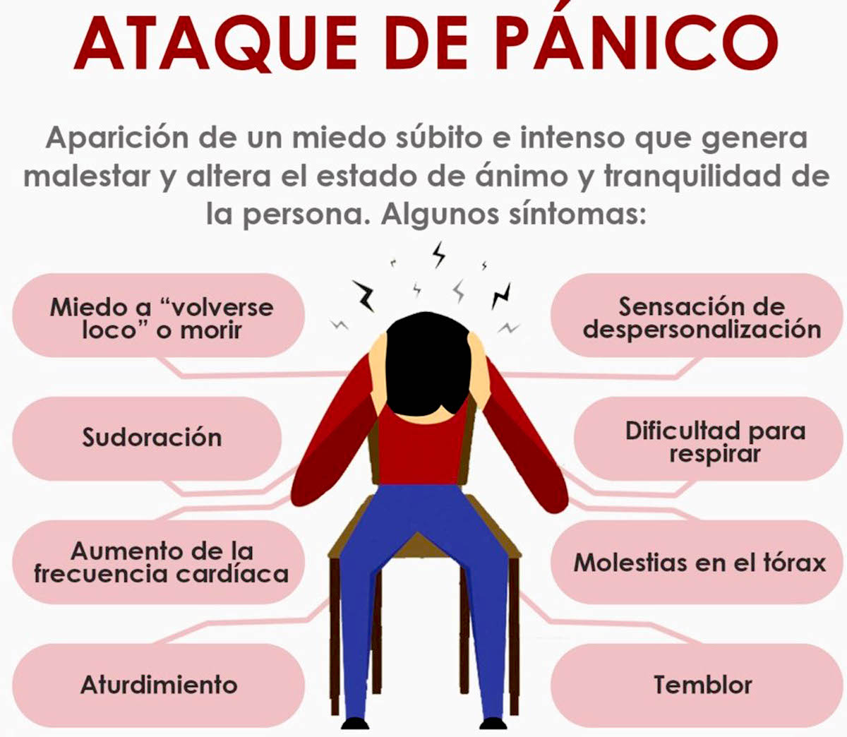 “Sensación de que los latidos del corazón se incrementan de manera importante y súbita, (taquicardia), esto se asocia con la idea de que estoy en peligro, que puedo fallecer por un ataque cardiaco; sudoración en las manos y/o sudor frío; malestar general en el pecho; sensación de ahogo, como una especie de asfixia; percepción de desesperación o pérdida de control; nausea; mareo, entre otros”.